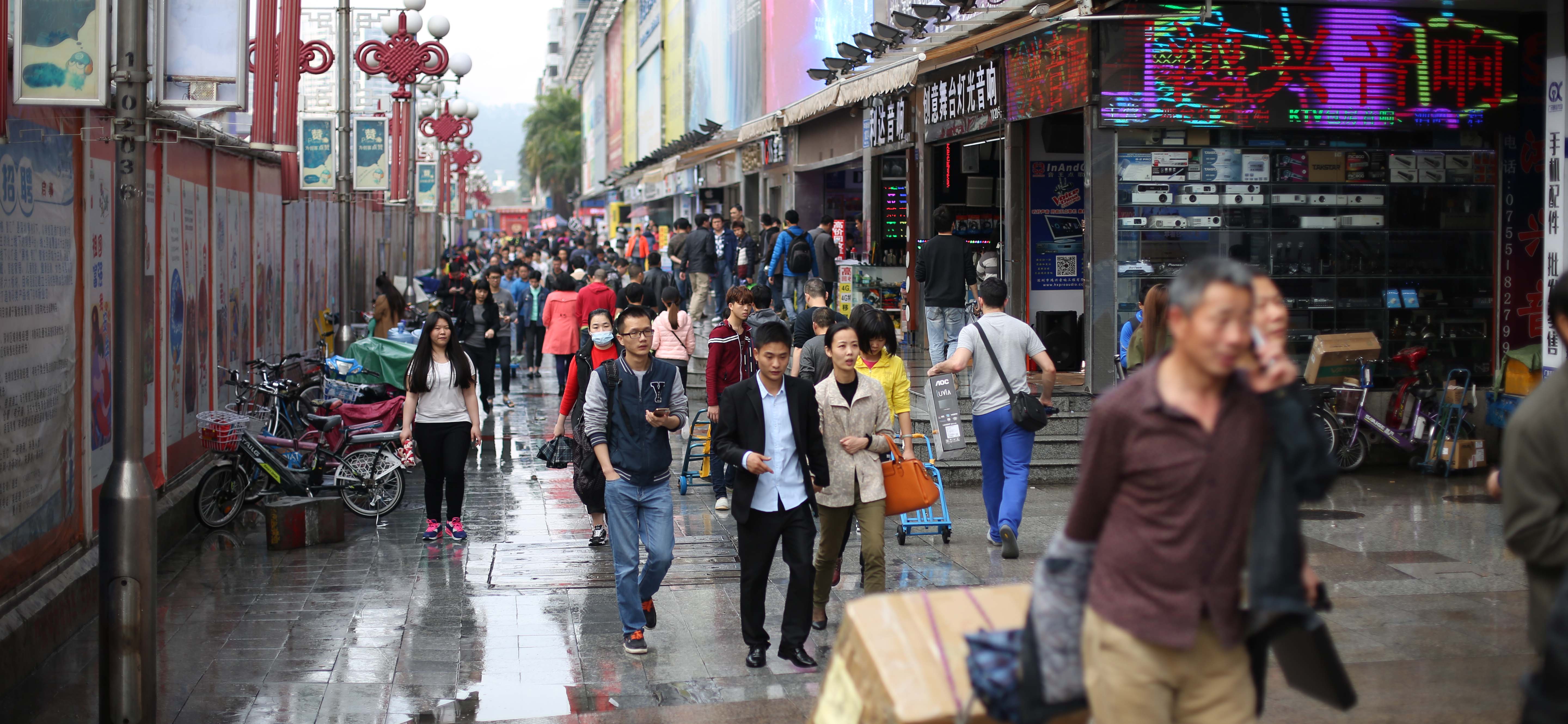 Shoppers outside Hua Qiang Bei, Shenzhen’s largest used electronics market.
