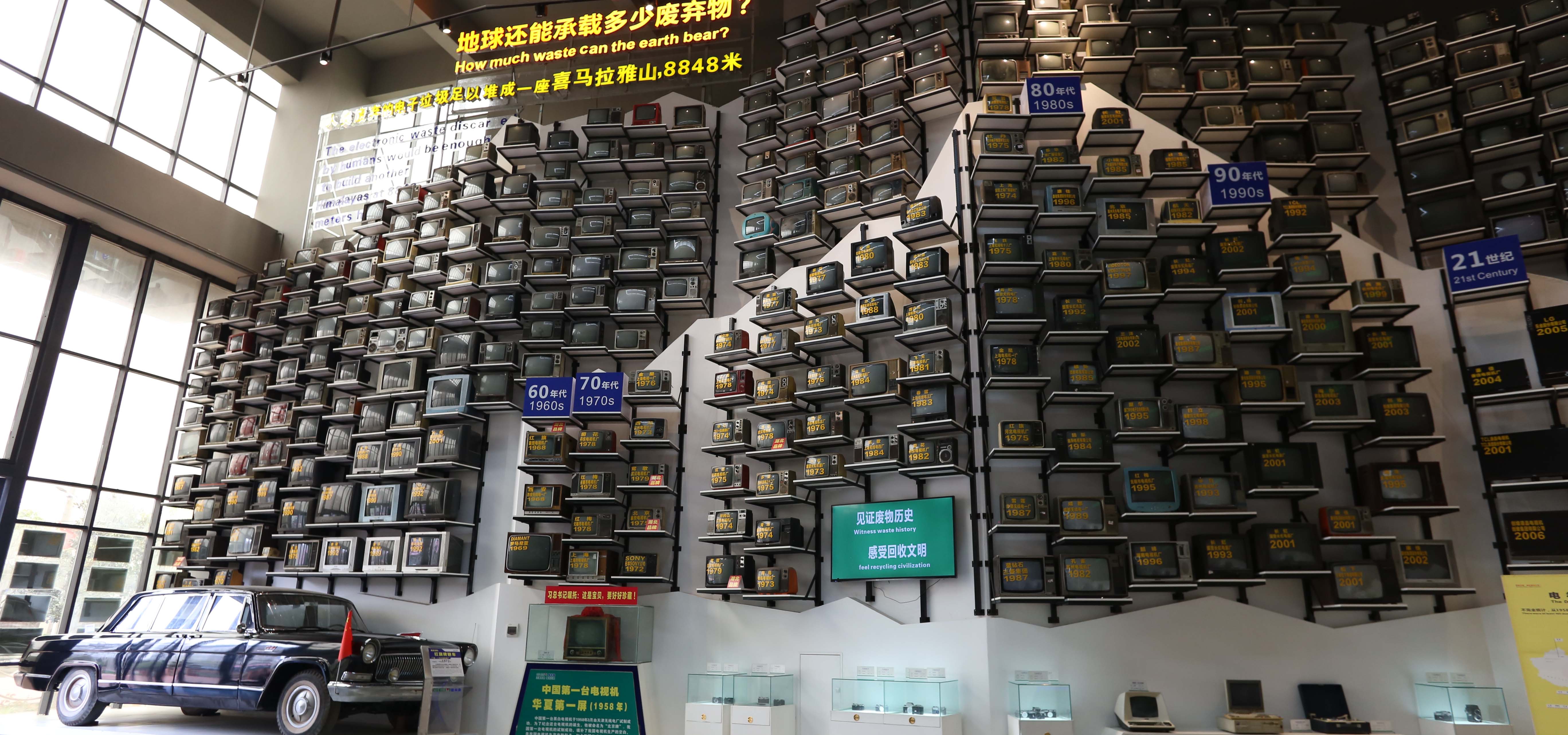 Stacks of old TV’s line the walls at GEM Recycling’s showroom in Hubei Province. The TV’s represent piles of discarded electronic waste that GEM says can be recycled and reused.