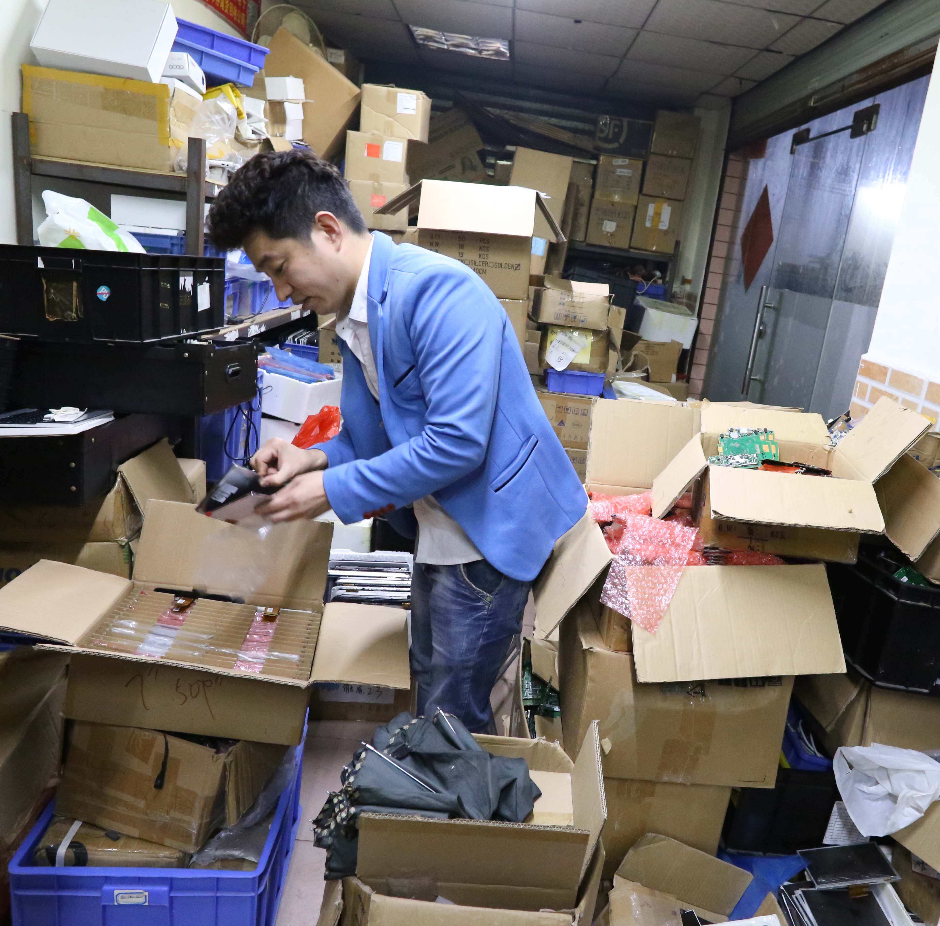 Liu Sheng and his friends collect and resell used electronics in a small storefront in Shenzhen. In China, thousands of small businesses rely on e-waste to make a living.