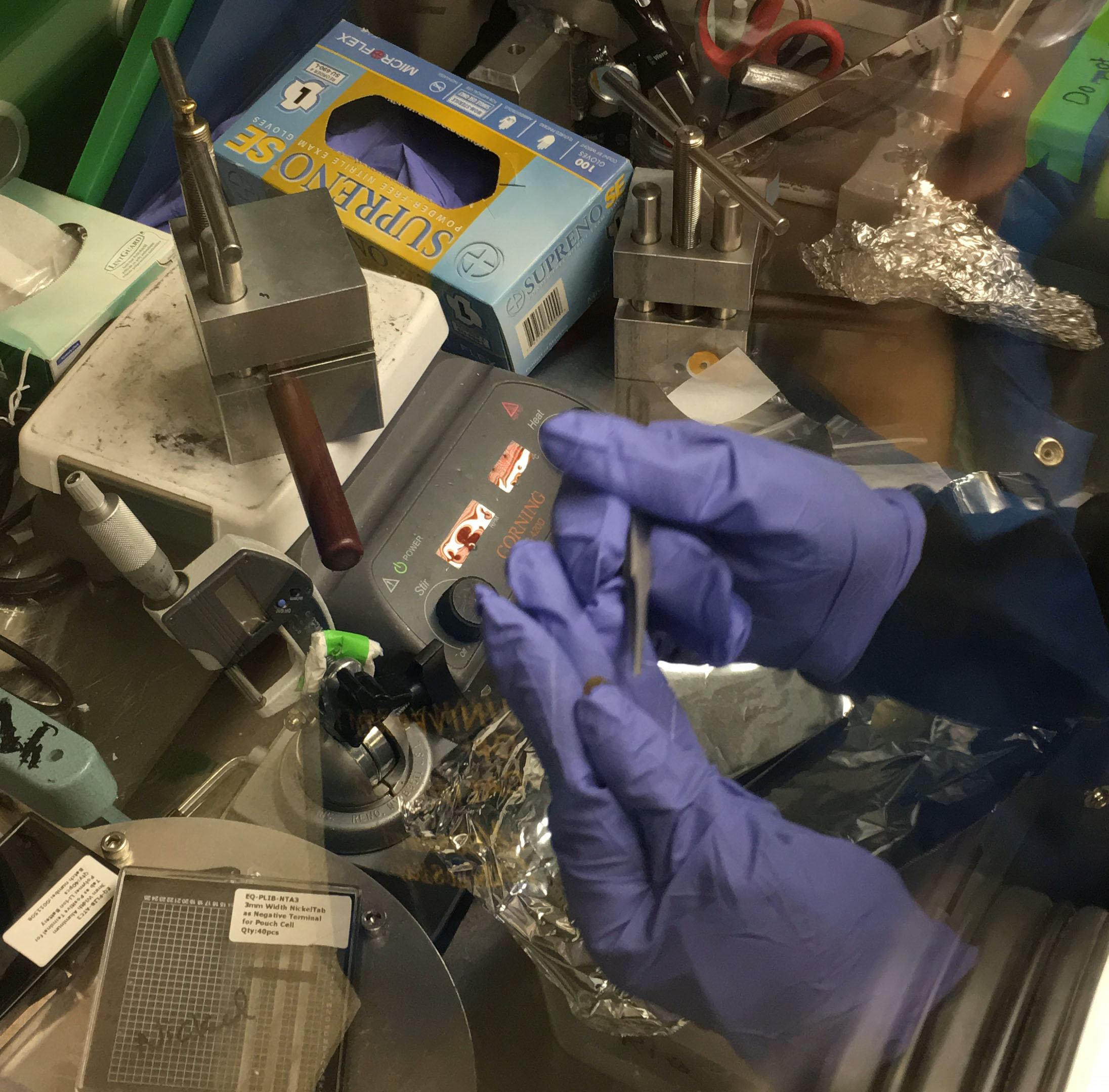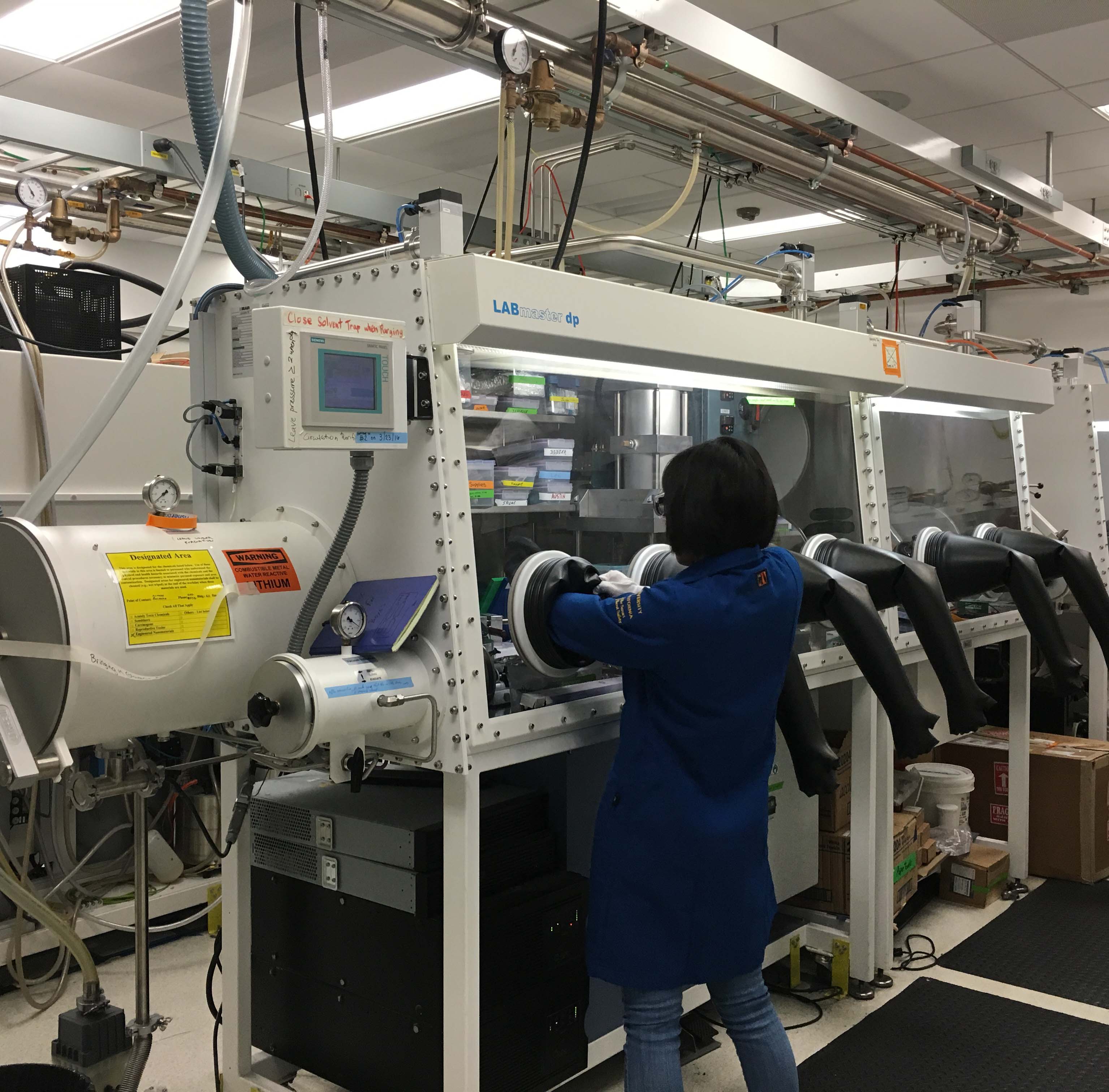 At the Berkeley lab where Didier Devaux conducts his work, researchers use chambers outfitted with thick rubber gloves—lithium can’t come into contact with air or water so the chambers are filled with argon—otherwise the metal would explode. Devaux, who has a Ph.D. in physical chemistry, is working on developing battery materials that optimize lithium battery performance without compromising safety. An electrolyte polymer that his team—the Balsara Battery Group—is working on is a rigid, solid polymer—unlike the flammable liquids in conventional lithium batteries.